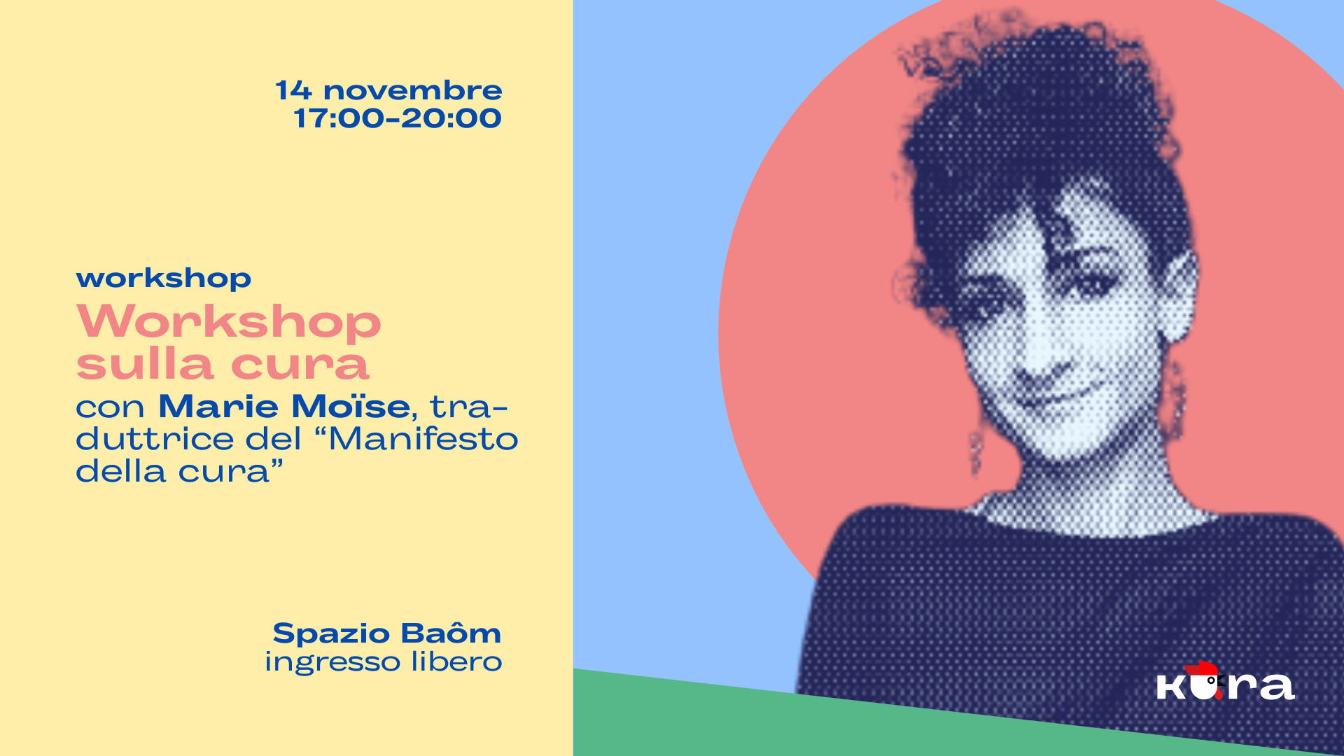 Marie Moïse, traduttrice del saggio Manifesto della Cura. Per una politica dell’interdipendenza, condurrà un workshop sulla cura. In particolare, esploreremo insieme il concetto di cura nei gruppi e nella collettività.